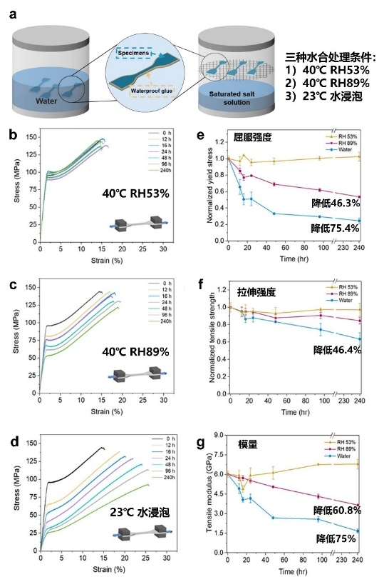 設(shè)計(jì)高/中/低三種水合條件(圖 2a),對(duì)樣品進(jìn)行總時(shí)長(zhǎng)為10天的水合處理,測(cè)試并分析不同條件下拉伸及彎曲性能隨時(shí)間的變化趨勢(shì)(圖2 b-g)。