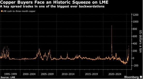 行情數(shù)據(jù)顯示,周一現(xiàn)貨銅價一度較三個月期貨價格高出了280美元/噸,創(chuàng)下自2021年創(chuàng)紀(jì)錄飆升以來的最大價差。這一巨幅現(xiàn)貨溢價(即逆價差)表明供應(yīng)短缺,而此前幾個月LME庫存正在迅速下降。