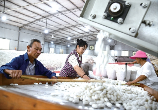 圖為村民在四川儀隴縣土門鎮(zhèn)初加工廠選繭