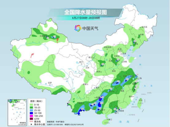 今明天(6月27日至28日),我國仍有大范圍降雨,呈現(xiàn)面弱點強的特點,黃淮等局地將現(xiàn)暴雨,且降雨的同時還可能伴有強對流天氣,公眾需關注預警預報,如遇雷暴大風或冰雹及時進建筑物內(nèi)躲避。同時,江南多地將上演高溫持久戰(zhàn),杭州等地高溫日數(shù)或達7天,需持續(xù)做好防暑措施。