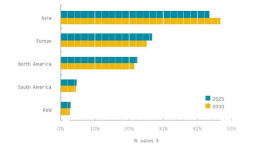 2025年,亞洲是非織造隔膜材料的最大區(qū)域市場,中國、韓國和日本均為主要生產(chǎn)國。歐洲和北美將繼續(xù)保持競爭力,尤其是在新型非織造電池隔膜的研發(fā)與應用方面,盡管兩者在未來五年均面臨重大挑戰(zhàn)。到2030年,歐洲在電動汽車轉型、鋰電池隔膜中非織造材料的應用以及超級工廠數(shù)量方面將繼續(xù)領先于北美,但將落后于亞洲。