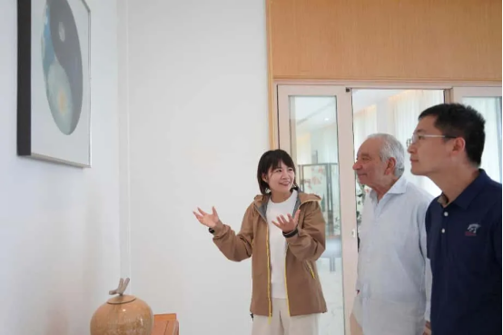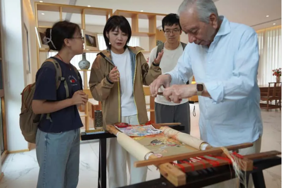 在薛憶的陪同下,Kamaljit Bawa院士一行參觀了“千鶴絲語”蠶桑文化展示中心及蠶桑生產(chǎn)基地。在楊家繡坊,薛憶重點介紹了國家級非物質(zhì)文化遺產(chǎn)——蜀繡,講解其以細膩針法、自然寫意、色彩層次豐富著稱的獨特藝術價值。Bawa院士對蜀繡的精湛刺繡技藝表示由衷贊嘆,認為其不僅展現(xiàn)了中國傳統(tǒng)工藝的高度,也體現(xiàn)了自然與文化深度融合的美學追求。