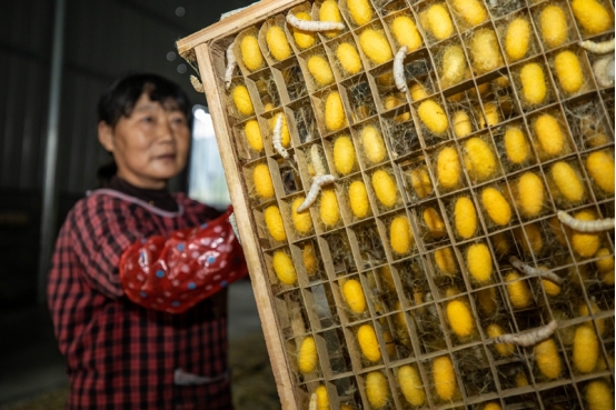 黃金繭色澤金黃,無(wú)需染色,抗氧化與抑菌性能優(yōu)異,適合高端絲綢制品。引入黃金繭后,村民在家門口實(shí)現(xiàn)了“人人有事做,家家有收入”的致富夢(mèng)。“村里幾乎家家種桑養(yǎng)蠶,實(shí)現(xiàn)戶均年增收3萬(wàn)元,村集體年收入也有45萬(wàn)元?!痹S義鳳介紹。