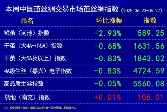 今日(周五)生絲電子盤面各遠(yuǎn)近合約價(jià)格繼續(xù)小幅收綠,成交集中在近月合約,250925合約有所增倉。受到近期適應(yīng)內(nèi)外銷的生絲拿貨表現(xiàn)和蠶繭收購態(tài)勢(shì)等影響,本周4A級(jí)生絲電子指數(shù)環(huán)比上周下跌0.83%。