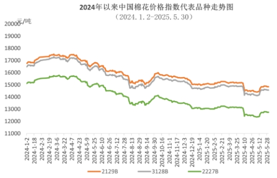5月上旬,在美國(guó)關(guān)稅政策的不確定性影響下,中國(guó)棉花價(jià)格指數(shù)維持震蕩走勢(shì);中下旬,國(guó)內(nèi)出臺(tái)降息降準(zhǔn)政策、中美就經(jīng)貿(mào)問(wèn)題進(jìn)行會(huì)談并發(fā)布聯(lián)合聲明,釋放積極信號(hào),市場(chǎng)信心得到顯著提升,中國(guó)棉花價(jià)格指數(shù)最高漲至14621元/噸;月末市場(chǎng)利好逐漸消化,加上紡織行業(yè)進(jìn)入傳統(tǒng)淡季,訂單未有明顯好轉(zhuǎn),中國(guó)棉花價(jià)格指數(shù)小幅回落。5月中國(guó)棉花價(jià)格指數(shù)(CCIndex3128B)月均價(jià)為14445元/噸,環(huán)比上漲78元,同比下跌1997元。