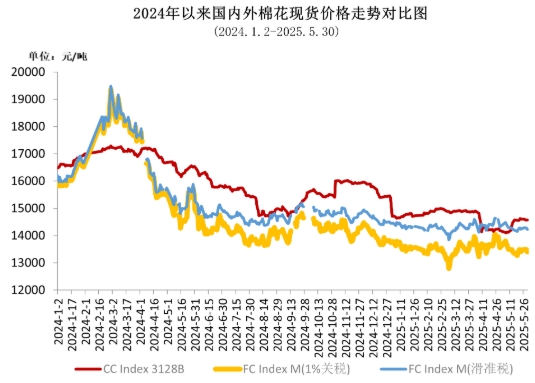 5月,國(guó)內(nèi)出臺(tái)降準(zhǔn)降息一攬子金融政策,中美日內(nèi)瓦經(jīng)貿(mào)會(huì)談聯(lián)合聲明發(fā)布,大幅降低雙邊關(guān)稅水平,宏觀氛圍明顯好轉(zhuǎn),提振國(guó)內(nèi)棉價(jià)上漲。但棉紡行業(yè)淡季特征明顯,新訂單不足,加上今年氣候條件正常,新棉豐產(chǎn)預(yù)期較強(qiáng),棉價(jià)上漲空間受到抑制。月內(nèi)中國(guó)棉花價(jià)格指數(shù)沖高后有所回落,月均價(jià)略有上漲。同期國(guó)際棉價(jià)月初在關(guān)稅政策利好消息支撐下大幅反彈,但后期因美國(guó)政策不斷反復(fù)呈震蕩走勢(shì),月末在美元走強(qiáng)等因素影響下有所回落。