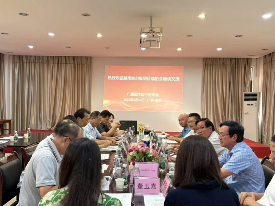 6月26日,越南紡織集團(tuán)董事局副主席陳光毅先生率領(lǐng)越南紡織代表團(tuán)一行9人,到訪廣西繭絲綢行業(yè)協(xié)會(huì),雙方舉行座談交流會(huì),并參觀考察廣西農(nóng)投桂合絲綢有限公司。中國(guó)絲綢協(xié)會(huì)副會(huì)長(zhǎng)、廣西繭絲綢行業(yè)協(xié)會(huì)會(huì)長(zhǎng)賴以軍,廣西大宗繭絲國(guó)際交易中心有限公司董事長(zhǎng)陳暉、廣西南寧市邕州蠶種有限公司執(zhí)行董事趙中華、廣西蠶業(yè)技術(shù)推廣站育種研究室副主任黃文功等參加座談會(huì)并交流發(fā)言。越桂座談會(huì)由民建廣西區(qū)委企業(yè)委員會(huì)周善才副秘書長(zhǎng)主持,廣西繭絲綢行業(yè)協(xié)會(huì)秘書長(zhǎng)肖雪峰陪同越南代表團(tuán)參觀考察廣西桂合公司、參加座談交流會(huì)。