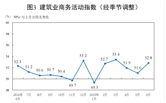 分行業(yè)看,建筑業(yè)商務活動指數為52.8%,比上月上升1.8個百分點;服務業(yè)商務活動指數為50.1%,比上月下降0.1個百分點。從行業(yè)看,郵政、電信廣播電視及衛(wèi)星傳輸服務、互聯(lián)網軟件及信息技術服務、貨幣金融服務、資本市場服務、保險等行業(yè)商務活動指數均位于55.0%以上較高景氣區(qū)間;零售、道路運輸、航空運輸、住宿、餐飲、房地產等行業(yè)商務活動指數均低于臨界點。