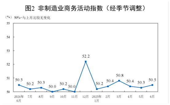 6月份,非制造業(yè)商務活動指數為50.5%,比上月上升0.2個百分點,非制造業(yè)總體繼續(xù)保持擴張。