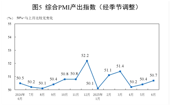 6月份,綜合PMI產出指數為50.7%,比上月上升0.3個百分點,表明我國企業(yè)生產經營活動總體擴張有所加快。
