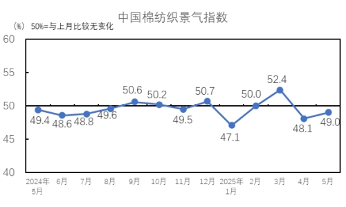2025年5月,原料采購(gòu)指數(shù)為49.7%,低于臨界點(diǎn),較4月上升2.2個(gè)百分點(diǎn)。棉花方面,《中美日內(nèi)瓦經(jīng)貿(mào)會(huì)談聯(lián)合聲明》發(fā)布后,宏觀利好帶動(dòng)鄭棉及棉花現(xiàn)貨價(jià)格小幅沖高,上漲后棉價(jià)維持平穩(wěn)運(yùn)行,主力合約最高觸及13560元/噸。滌綸短纖方面,5月受地緣局勢(shì)升溫和中美貿(mào)易層面出現(xiàn)積極進(jìn)展影響,原油價(jià)格反彈,隨后受美伊談判和俄烏談判方面進(jìn)展影響油價(jià)震蕩走弱,滌綸短纖跟隨原料價(jià)格沖高回落。粘膠短纖方面,市場(chǎng)淡季行情持續(xù),下游需求偏弱,紡企盈利水平較低,粘膠短纖價(jià)格震蕩下降。據(jù)TTEB數(shù)據(jù),國(guó)內(nèi)3128級(jí)棉花現(xiàn)貨月均價(jià)14261元/噸,環(huán)比上漲401元/噸,漲幅2.89%;1.4D直紡滌綸短纖月均價(jià)6612元/噸,環(huán)比上漲158元/噸,漲幅2.45%;主流粘膠纖維月均價(jià)12995元/噸,環(huán)比下降200元/噸,降幅1.52%。從采購(gòu)量看,5月淡季行情持續(xù),下游紗廠、織廠、終端廠商等均保持觀望,市場(chǎng)維持弱勢(shì),紡企原料采購(gòu)下降。棉花采購(gòu)指數(shù)47.5%,較4月下降1.1個(gè)百分點(diǎn),低于臨界點(diǎn);非棉纖維采購(gòu)指數(shù)47.8%,較4月下降2.1個(gè)百分點(diǎn),低于臨界點(diǎn)。