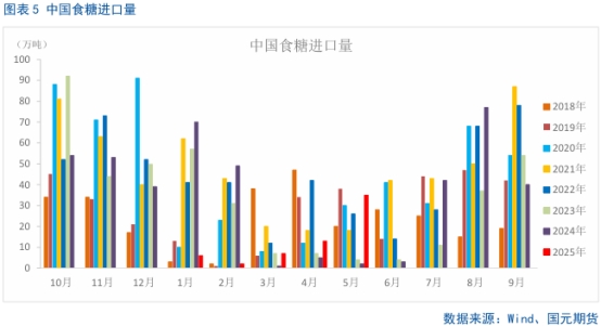 5月我國食糖進(jìn)口已經(jīng)有了放量的趨勢。據(jù)海關(guān)總署公布的數(shù)據(jù)顯示,2025年5月份我國進(jìn)口食糖35萬噸,同比增加33.31萬噸。2025年1-5月份我國進(jìn)口食糖63.32萬噸,同比減少64.12萬噸,降幅50.31%。2024/25榨季截至5月,我國進(jìn)口食糖209.50萬噸,同比下降103.93萬噸,降幅33.16%。