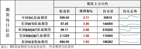 【1】WTI主力原油期貨收漲2美元,漲幅3.06%,報67.45美元/桶;布倫特主力原油期貨收漲2美元,漲幅2.98%,報69.11美元/桶;INE原油期貨收漲2.11%,報509元。
