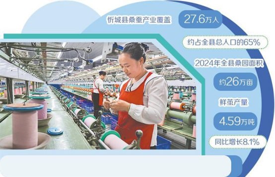 智能化的種桑養(yǎng)蠶技術,正在忻城這個全國桑蠶生產大縣推廣。忻城縣桑蠶產業(yè)覆蓋27.6萬人,約占全縣總人口的65%。2024年全縣桑園面積約26萬畝,鮮繭產量4.59萬噸,同比增長8.1%;鮮繭產值約29.37億元,同比增長8.1%。