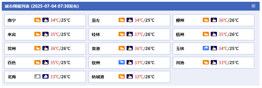 今天白天到晚上,防城港、欽州、北海、崇左、百色等市多云有陣雨或雷雨、局地大雨,其它地區(qū)多云到晴、局地有陣雨或雷雨。桂東部分地區(qū)最高氣溫34~36℃,局地37℃以上。