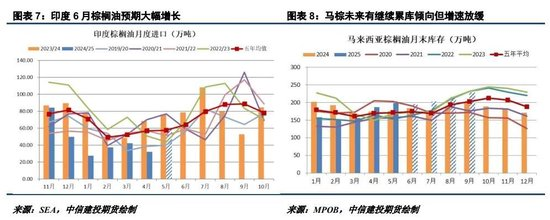 馬棕4-5月的連續(xù)大幅累庫一度令棕櫚油走勢承壓,然而,隨著馬棕產(chǎn)量增長放緩而出口保持高位,馬棕未來幾個月的累庫速度有望放緩。MPOA預(yù)計馬棕6月產(chǎn)量較上月同期降4.59%至169萬噸,船運機(jī)構(gòu)預(yù)計的馬棕同期出口增4.3%-11.7%,暗示馬棕6月可能去庫。路透調(diào)查平均預(yù)計馬棕6月產(chǎn)量環(huán)比降4.04%至170萬噸,出口環(huán)比增4.16%至145萬噸,月末庫存環(huán)比小降0.24%至198.5萬噸,這或助力增產(chǎn)題材對棕櫚油價格的利空出盡。