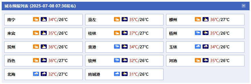 今天白天到晚上,百色、崇左、防城港、欽州、北海、玉林等市有中雨、局地大雨或暴雨并伴有短時雷暴大風等強對流天氣,其它地區(qū)多云有陣雨或雷雨、局地大雨。桂西、桂北部分地區(qū)最高氣溫34~36℃、局地37℃以上。