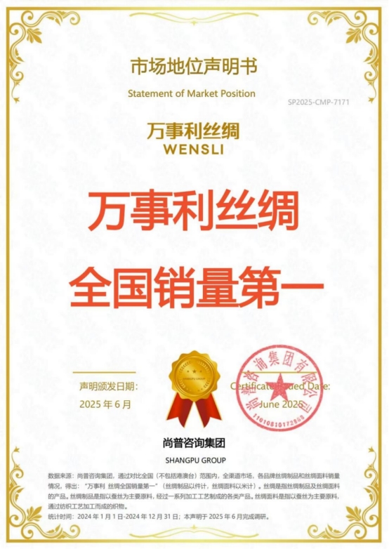 近日,根據(jù)市場(chǎng)研究機(jī)構(gòu)尚普咨詢發(fā)布的數(shù)據(jù),萬事利絲綢(公司簡(jiǎn)稱:萬事利,股票代碼:301066)憑借強(qiáng)勁的市場(chǎng)表現(xiàn)榮膺2024年度全國(guó)絲綢銷量第一。這一成績(jī)不僅彰顯了其在傳統(tǒng)絲綢行業(yè)中的標(biāo)桿地位,也代表著中國(guó)絲綢品牌在創(chuàng)新驅(qū)動(dòng)下的華麗蝶變。