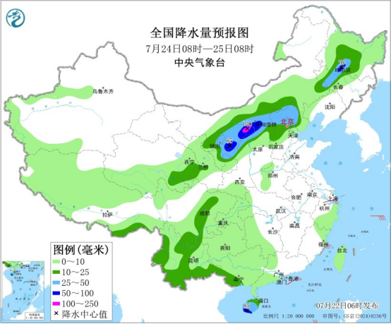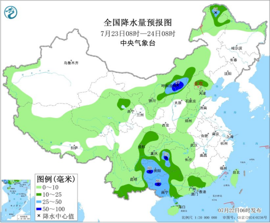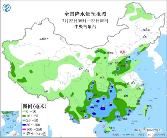 圖3 全國降水量預報圖(7月22日08時-23日08時)