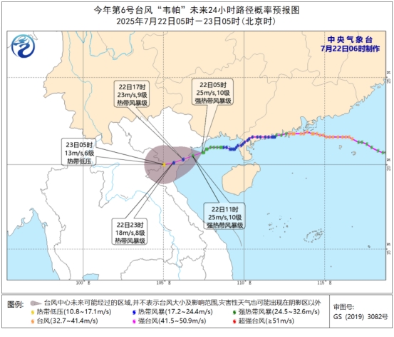 7月22日08時至23日08時,受“韋帕”和西南季風的共同影響,南海大部、北部灣、瓊州海峽、西沙群島、中沙群島、南沙群島以及海南島沿海、廣東西南部沿海、廣西沿海等地將有6~7級風,陣風8~9級,其中北部灣、廣西沿海、海南島西部沿海的風力可達8~9級,陣風10~11級,北部灣部分海域風力有10級,陣風11~12級。中央氣象臺7月22日06時繼續(xù)發(fā)布臺風黃色預警。