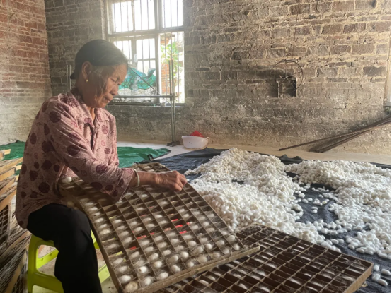 農(nóng)戶正在分裝即將售賣的鮮繭