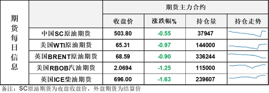 【1】WTI主力原油期貨收跌0.64美元,跌幅0.97%,報(bào)65.31美元/桶;布倫特主力原油期貨收跌0.62美元,跌幅0.9%,報(bào)68.59美元/桶;INE原油期貨收跌0.55%,報(bào)503.8元。
