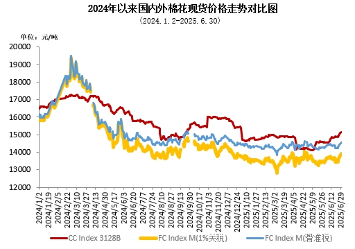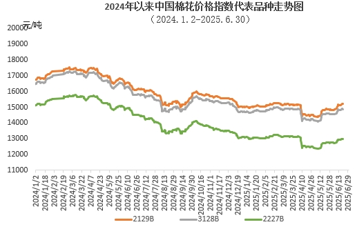 月初,中國棉花價格指數(shù)延續(xù)上月跌勢有所回落,之后中美倫敦貿(mào)易磋商取得進展,緩解出口企業(yè)擔(dān)憂,市場信心有所增強,棉價止跌反彈至14850元/噸附近,中下旬中美倫敦會談框架細節(jié)進一步確認,央行等六部門聯(lián)合印發(fā)《關(guān)于金融支持提振和擴大消費的指導(dǎo)意見》,激活消費市場潛力,市場情緒得到提振,加上新疆持續(xù)性高溫天氣不利棉花生長,中國棉花價格指數(shù)最高漲至15154元/噸。6月中國棉花價格指數(shù)(CCIndex3128B)月均價為14817元/噸,環(huán)比上漲372元,同比下跌1212元。