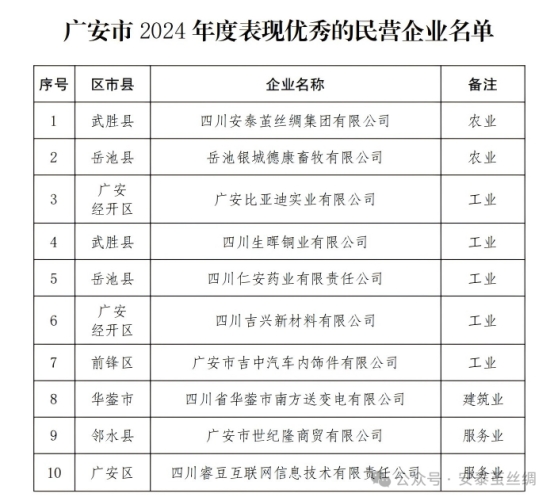 近日,廣安市 2024 年度表現(xiàn)優(yōu)秀的民營企業(yè)名單正式公布,四川安泰繭絲綢集團有限公司憑借在農(nóng)業(yè)領(lǐng)域的突出表現(xiàn),作為武勝縣唯一入選的農(nóng)業(yè)企業(yè)光榮上榜,這份來自中共廣安市委辦公室、廣安市人民政府辦公室的通報表揚,是對企業(yè)過去一年深耕主業(yè)、助力地方發(fā)展的高度肯定。