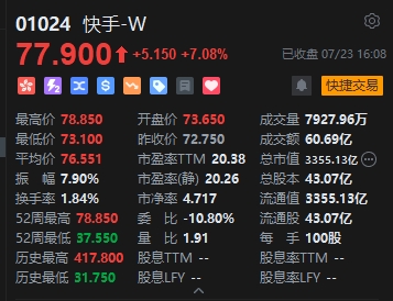 快手市值超越泡泡瑪特。近期,多家國際券商倉位頻頻買入快手。港交所文件顯示,7月3日,摩根大通增持快手好倉458.85萬股,平均買入價格為60.84港元/股。目前,該筆投資已浮盈接近 8000萬港元。增持完成后,摩根大通對快手-W(77.9, 5.15, 7.08%)持好倉數(shù)目為1.8億股,持好倉比例由4.92%上升至 5.05%。