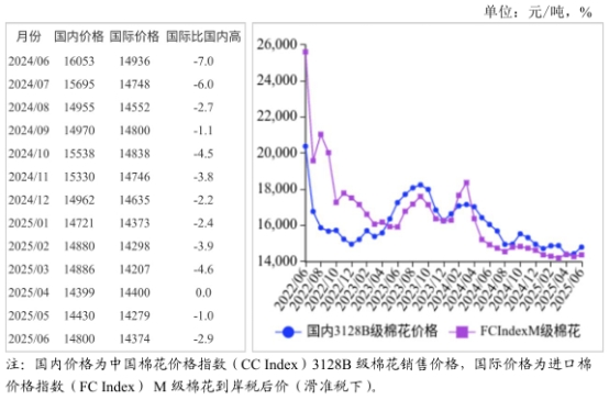 (一)國內(nèi)棉價(jià)環(huán)比小幅上漲。當(dāng)前棉花消化進(jìn)度較快,庫存總量繼續(xù)下降,供應(yīng)趨緊預(yù)期支撐棉價(jià)小幅上漲。據(jù)國家棉花市場監(jiān)測數(shù)據(jù)顯示,截至6月26日,全國棉花銷售率93.2%,較過去4年均值提高7.4個(gè)百分點(diǎn)。6月,國內(nèi)3128B級(jí)棉花月均價(jià)每噸14800元,環(huán)比漲2.6%,同比跌7.8%。鄭棉期貨主力合約(CF2509)月結(jié)算價(jià)每噸13685元,環(huán)比漲2.7%,同比跌6.9%。