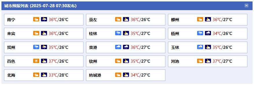 南寧市:今天白天多云、午后局地有陣雨或雷雨,今天晚上多云有陣雨,東北風(fēng)1~2級,最高氣溫36℃,最低氣溫26℃。