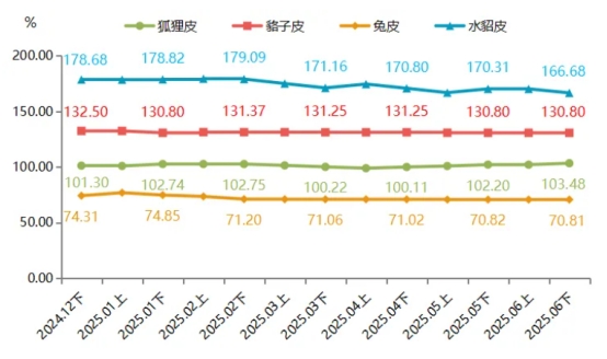 2025年上半年,四大類熟皮價格指數(shù)呈“一漲三跌”的分化走勢。其中,狐貍皮價格指數(shù)表現(xiàn)突出,6月下半月指數(shù)收于103.48點,較2024年底上漲2.15%。相比之下,其他三類熟皮價格均有不同程度回落:受進(jìn)口水貂皮價格指數(shù)上半年下降14.57%影響,水貂皮價格指數(shù)整體波動下滑,6月下半月指數(shù)收于166.68點,較2024年底下跌6.72%;受國產(chǎn)貉子皮供給充足影響,6月下半月貉子皮價格指數(shù)為130.80點,較2024年底下跌1.28%;兔皮價格指數(shù)收于70.81點,較2024年底下跌4.71%,其中,進(jìn)口兔皮價格下跌17.54%,而國產(chǎn)兔皮逆勢上漲4.07%,主要是因為國產(chǎn)兔皮質(zhì)量提升,對進(jìn)口兔皮形成替代作用。