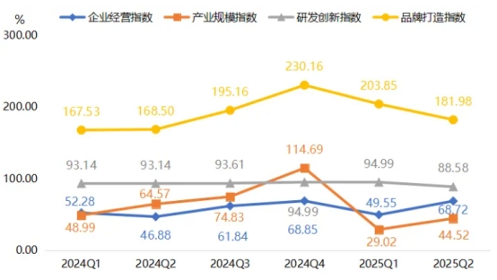 品牌打造指數(shù)從相對高位持續(xù)下滑。截至二季度指數(shù)收報于181.98點,環(huán)比下降10.73%,同比增長8.00%。