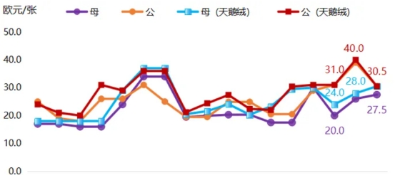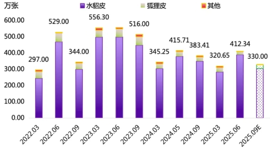 從供給端看,國內(nèi)皮張庫存維持高位,進(jìn)口水貂皮價格持續(xù)下行疊加國產(chǎn)優(yōu)質(zhì)皮張?zhí)娲?yīng)增強(qiáng),市場供應(yīng)保持寬松。