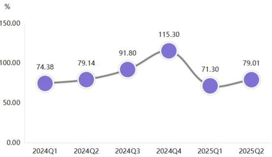 產(chǎn)業(yè)規(guī)模指數(shù)承壓下探后稍有上升。截至二季度,指數(shù)收報于44.52點,環(huán)比上升53.40%,同比下滑31.05%。2025年上半年,有效需求不足使得企業(yè)庫存高企,疊加出口市場收縮影響,促使產(chǎn)業(yè)規(guī)模指數(shù)承壓運行。