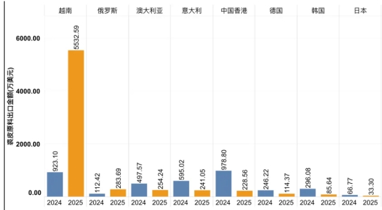 從出口目的國來看,2025年上半年,我國原料皮主要出口至越南的金額最多。這首先是因為隨著《區(qū)域全面經(jīng)濟(jì)伙伴關(guān)系協(xié)定》(RCEP)全面實施及中國-東盟自貿(mào)區(qū)3.0版談判實質(zhì)性結(jié)束,中越貿(mào)易成本降低。其次,越南進(jìn)口中國原料關(guān)稅成本下降,且原產(chǎn)地累積規(guī)則使企業(yè)更易享受關(guān)稅優(yōu)惠。同時,越南工業(yè)化和城市化進(jìn)程加速,制造業(yè)擴(kuò)張催生原料需求增加。此外,在美國對華關(guān)稅政策影響下,部分中國皮草企業(yè)將越南作為區(qū)域生產(chǎn)樞紐。因此,2025年上半年,越南等新興市場對我國裘皮原料的需求增長明顯。