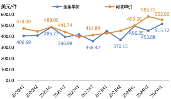 2025年上半年,全國、河北省毛皮衣服出口金額下降,但是全國、河北省毛皮衣服出口單價分別為515.72、552.96美元/件,較2024年上半年分別上漲3.92%、10.75%。