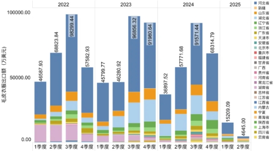 外需收縮,影響我國毛皮服裝出口金額下行。目前,我國、河北省出口毛皮服裝金額均處于近年來的低位。據(jù)海關(guān)數(shù)據(jù),2025年上半年,我國毛皮衣服出口金額為1.99億美元,較2024年上半年出口金額減少79.03%。其中,河北省出口毛皮衣服1.03億美元,較2024年上半年出口金額減少80.25%,全球經(jīng)濟(jì)增速放緩,影響河北省乃至我國裘皮服裝市場出口金額減少。