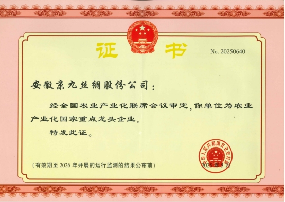 近日,經(jīng)全國農(nóng)業(yè)產(chǎn)業(yè)化聯(lián)席會議審定,安徽京九絲綢股份公司憑借突出的產(chǎn)業(yè)實力、卓越的創(chuàng)新能力和強(qiáng)大的聯(lián)農(nóng)帶農(nóng)效應(yīng),再次被評定為“農(nóng)業(yè)產(chǎn)業(yè)化國家重點龍頭企業(yè)”。這一結(jié)果不僅是對企業(yè)持續(xù)領(lǐng)跑行業(yè)的權(quán)威認(rèn)證,更標(biāo)志著公司作為國家級絲綢產(chǎn)業(yè)標(biāo)桿的綜合實力與社會貢獻(xiàn)獲得國家層面的高度認(rèn)可。