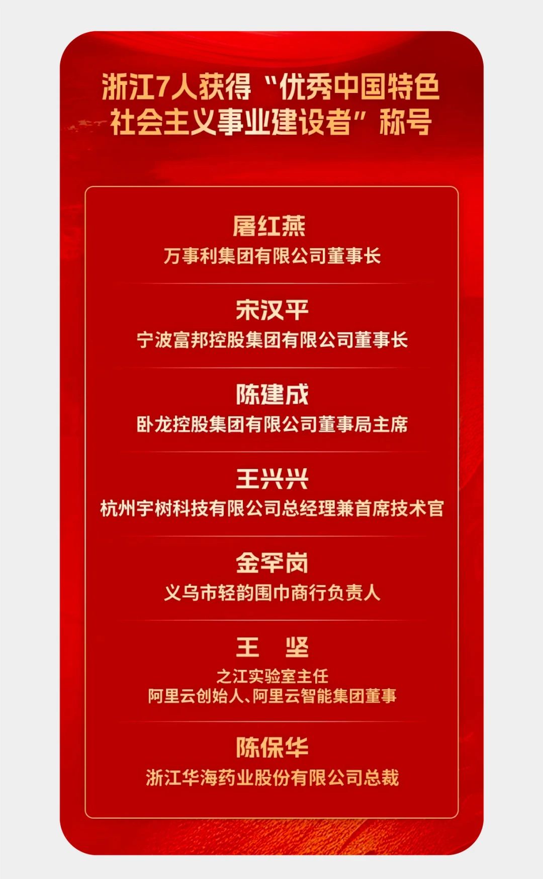作為浙江民營經(jīng)濟(jì)的優(yōu)秀代表,萬事利集團(tuán)董事長屠紅燕與之江實(shí)驗(yàn)室主任、阿里云創(chuàng)始人王堅(jiān),杭州宇樹科技總經(jīng)理兼首席執(zhí)行官王興興、臥龍控股集團(tuán)董事局主席陳建成等共7人榮獲“優(yōu)秀中國特色社會主義事業(yè)建設(shè)者”稱號。