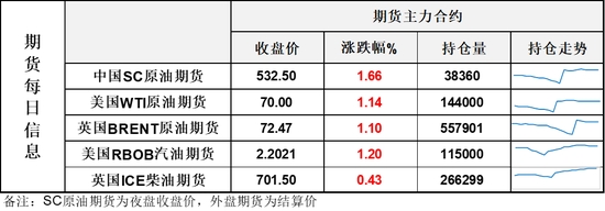 【1】WTI主力原油期貨收漲0.79美元,漲幅1.14%,報70美元/桶;布倫特主力原油期貨收漲0.79美元,漲幅1.1%,報72.47美元/桶;INE原油期貨收漲1.66%,報532.5元。