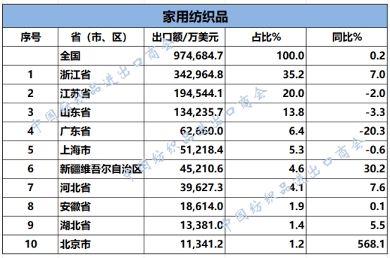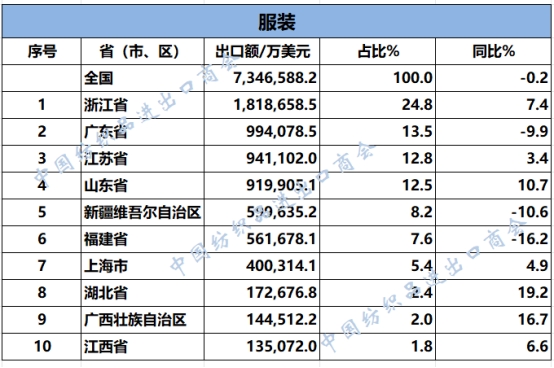 2025年1-6月紡織服裝類重點商品出口前十名的省(市、區(qū))