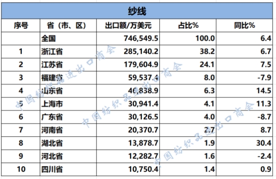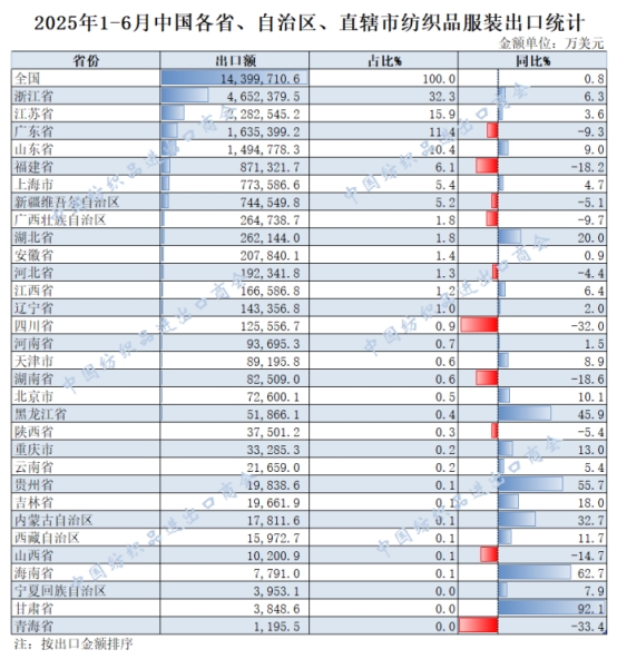 2025年1-6月,我國紡織服裝累計出口1439.97億美元,同比增長0.8%。浙江省、江蘇省、廣東省、山東省、福建省分別列全國紡織服裝出口省市前五位,合計比重超七成。