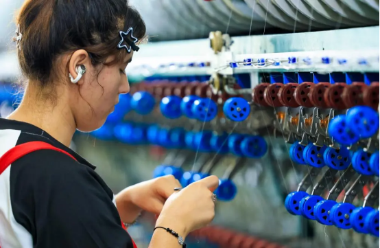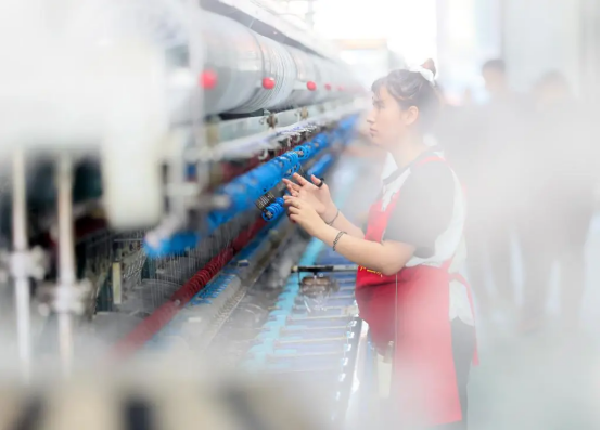 7月29日,在新疆絲錦絲綢紡織有限公司生產(chǎn)車間內(nèi),工人查看絲線。新華社發(fā)(蘭紅光攝)