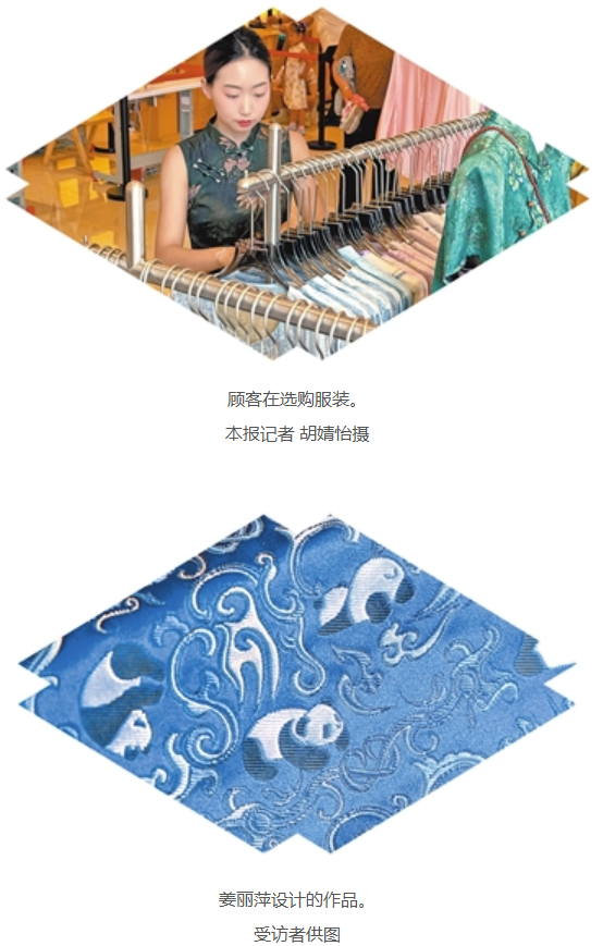 “這款裙子上是我們設計的熊貓云氣紋,很有四川特色?!泵考髌繁澈蟮膩睚埲ッ},姜麗萍都能娓娓道來,有消費者聽完介紹便下單定制。