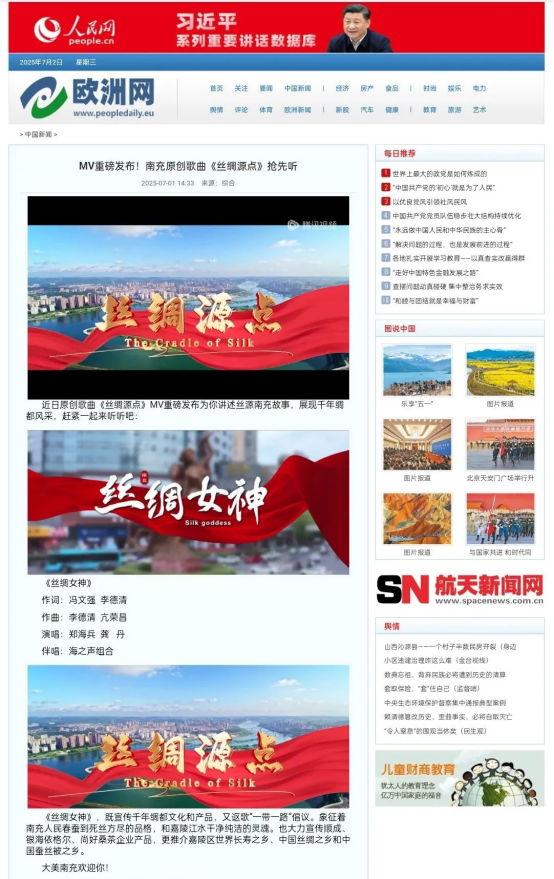 近日,由南充本土創(chuàng)作的原創(chuàng)歌曲《絲綢源點(diǎn)》在《人民日?qǐng)?bào)》歐洲網(wǎng)頭條刊發(fā),引發(fā)海內(nèi)外關(guān)注。該歌曲以南充“中國(guó)綢都”歷史底蘊(yùn)為基底,通過(guò)音樂(lè)藝術(shù)展現(xiàn)絲綢文化與巴蜀文明的交融,成為中華文化國(guó)際傳播的又一亮點(diǎn)。