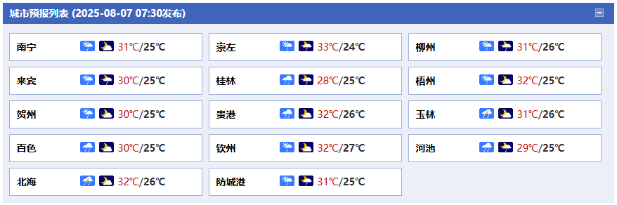 南寧市:今天白天到晚上,多云有雷陣雨、局地大雨,偏南風(fēng)2~3級,最高氣溫32℃,最低氣溫25℃。
