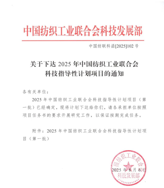 8月6日,中國(guó)紡聯(lián)科技發(fā)展部發(fā)布通知稱,2025年中國(guó)紡織工業(yè)聯(lián)合會(huì)科技指導(dǎo)性計(jì)劃項(xiàng)目(第一批)已經(jīng)確定,現(xiàn)將計(jì)劃下達(dá),請(qǐng)各承擔(dān)單位按照項(xiàng)目任務(wù)書的要求開展研究工作,以保證按期完成任務(wù)。以下為通知詳情。