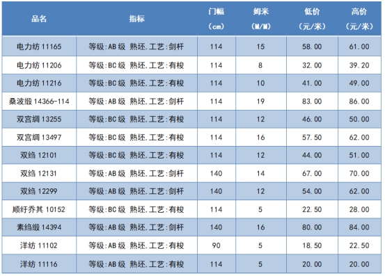 本周綢緞指數(shù)協(xié)作單位成交價(jià)格區(qū)間