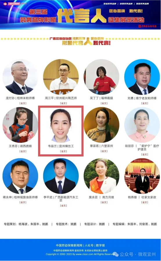 近日,第三屆“勞務(wù)品牌形象代言人”展播活動(dòng)正式啟動(dòng),同步在中國(guó)勞動(dòng)保障報(bào)社微信公眾號(hào)和中國(guó)勞動(dòng)保障新聞網(wǎng)集中展播38天。廣西河池市“宜州繅絲工”勞務(wù)品牌代言人韋益蘭入選參展。